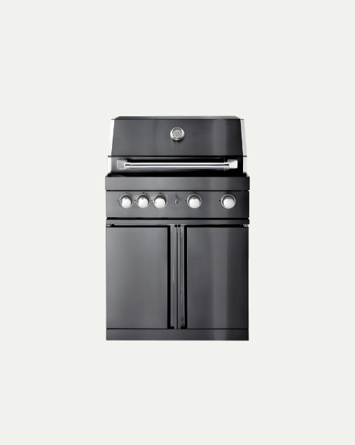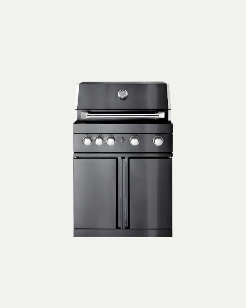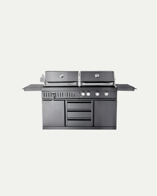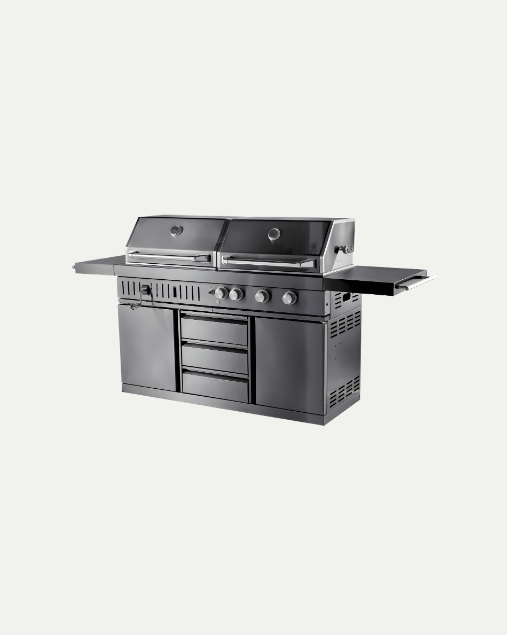 Barbecue à gaz autonome avec 4 brûleurs puissants, système infrarouge et rôtissoire pour des grillades variées. Compact et facile à déplacer, il s’adapte parfaitement aux espaces plus petits. Sa surface de cuisson de 71 x 46 cm et sa finition noire élégante en acier inoxydable 304 garantissent robustesse et qualité. Équipé de lumière intégrée et de boutons LED rétroéclairés, il offre une ambiance agréable même le soir. Le couvercle double paroi avec thermomètre maintient la chaleur tout en restant sûr au toucher. Les deux placards offrent un espace de rangement pratique pour ustensiles et bouteille de gaz. Possibilité d’ajouter un brûleur latéral et un réfrigérateur pour compléter votre cuisine extérieure et profiter pleinement de vos barbecues toute l’année.