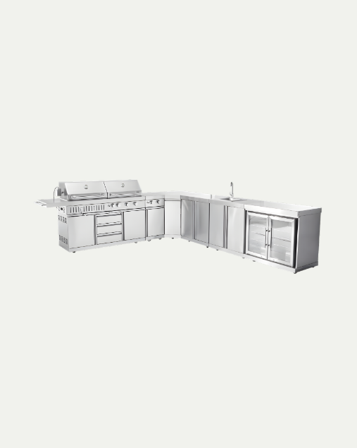Module d’angle autonome avec placard, à 90°, en acier inoxydable 304 de haute qualité et finition élégante. Il transforme votre cuisine extérieure en un espace de cuisson spacieux en L. Le dessus sert de plan de travail supplémentaire et l’étagère à l’intérieur offre un grand espace de rangement. Idéal pour créer une cuisine extérieure large et luxueuse sur votre terrasse ou dans votre jardin.