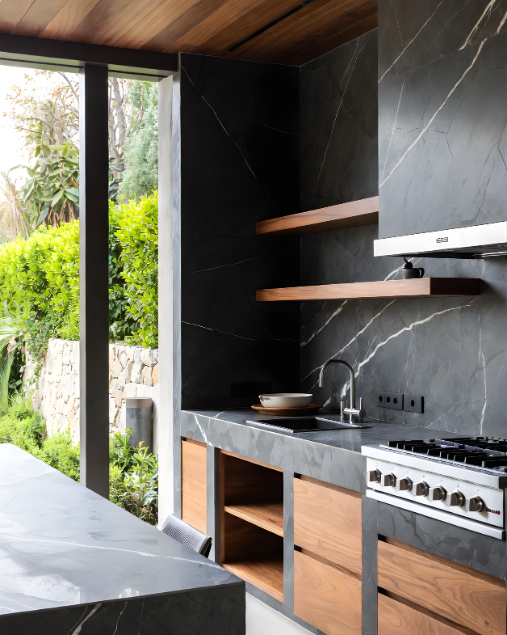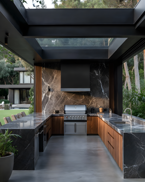 UNE CUISINE EXTÉRIEURE QUI ALLIE ESTHÉTIQUE FORTE, PERFORMANCE ET DURABILITÉ DANS UN ESPRIT RÉSOLUMENT MODERNE.