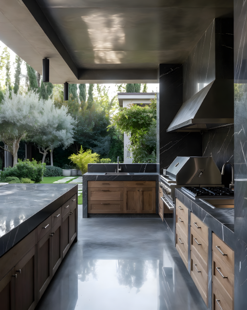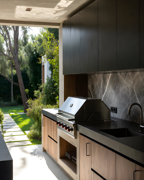DES LIGNES CONTEMPORAINES ET UNE FINITION NOIRE ÉLÉGANTE POUR UNE CUISINE EXTÉRIEURE AU STYLE PUISSANT ET INTEMPOREL.