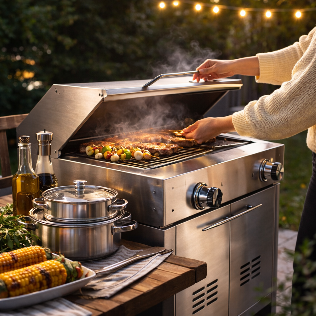 UNE COLLECTION CONÇUE EN ACIER INOXYDABLE POUR OFFRIR UNE RÉSISTANCE EXCEPTIONNELLE, UN DESIGN ÉPURÉ ET UNE EXPÉRIENCE DE CUISINE EXTÉRIEURE PENSÉE POUR DURER.
