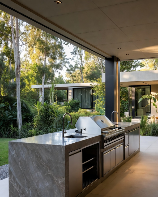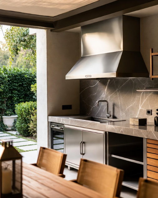 UNE CUISINE EXTÉRIEURE EN ACIER INOXYDABLE, IMAGINÉE POUR ALLIER PERFORMANCE, ÉLÉGANCE ET DURABILITÉ DANS TOUS LES ENVIRONNEMENTS.